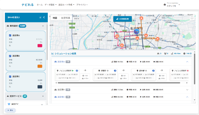 「ナビれる」は、こうした課題を解決するために開発されました。最大の特徴は、ワンクリックで最適な送迎ルートを自動作成できることです。煩雑な条件を瞬時に反映し、計画作成にかかる時間を削減。複数施設による「共同送迎」にも対応しており、より効率的な配車を実現します。